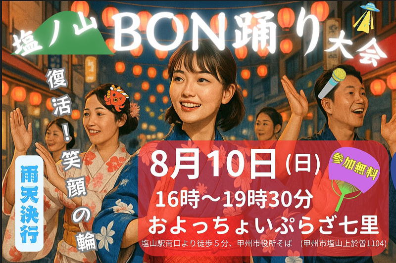 | 【感謝御礼】 「塩ノ山BON踊り大会」(およっちょいぷらざ七里)は、お陰様で100名以上のご来場で、大成功となりました ステージショーでは ぶどう様、あこそど様に、演奏&歌唱して頂き、花を添えて下さいました。 屋台は、フード研究所 縁 様、KEY 様に美味しい料理を、はいから屋 様に、楽しいくじ引きをご提供頂き、とても喜ばれました。 盆踊りでは、甲州市文化協会舞踊部 の皆様にご指導頂き、太鼓 の 長谷川一夫 様に盛り上がる演奏をご披露頂き、 郷土の先祖に感謝 しながら、明るい 笑顔の輪 がつくれました。 照明(提灯)は、ビデオルック 様で、華やかな空間演出ができ、音響 は、コバトーン 様に素敵な音をお作り頂きました。 ボランティアスタッフ の3名 様、タスクマスター の交通誘導員の方々には、円滑かつ安全な運営にお力添え頂きました。 スペシャルゲストに、甲府星人 さんもお越し下さり、愉快なひとときとなりました。 この盆踊り大会 は 文化芸術の振興を図り、地域住民の参加型で交流を促進し、商店街の活性化に繋げていく目的で行われました。 ご後援の 甲州市 様からは、鈴木幹夫 市長よりメッセージが寄せられ、披露いたしました。また、同じく後援の甲州市教育委員会 様からは、教育長の小林俊彦 様よりお祝いのご挨拶を頂戴しました。 ご協力くださいました、紅白のれん会 会長 山下義仁 様、株式会社ジブラボ 代表 桐山祐輔 様、甲州市文化協会舞踊部 部長 雨宮公子 様からもご挨拶頂きました。ほか、後援の 甲州市観光協会 様、甲州市商工会 様 ほかに、お力添え頂きました。 甲州市の地元のお客様、市外、県外からのお客様にご参加頂きまして、とても嬉しく思いました。 クラウドファンディング(目標を超える30万円を達成)へご支援くださいました皆様、ご近隣の皆様、 そして関わってくださいました、全ての皆様に心より感謝いたします。 2025年8月11日 オフィスかがみもち ※芸能活動の一環で行いました。 |