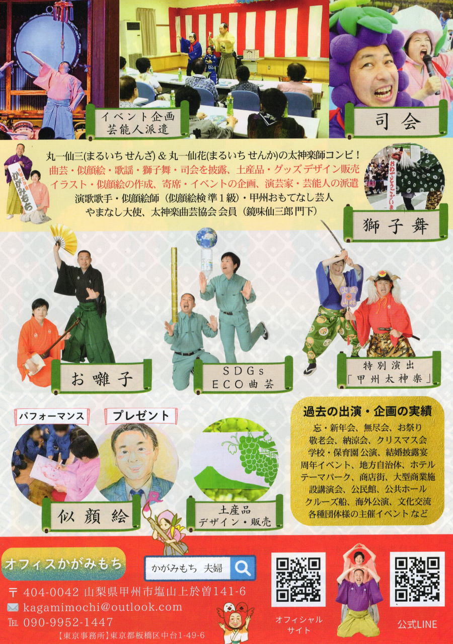 | オフィスかがみもち 〇余興・司会の出演 〇イベントのプロデュース 〇似顔絵・イラスト・デザインの作成 〇お土産品の制作・販売 かがみもち(夫婦太神楽) 丸一仙三・仙花(まるいち せんざ・せんか) 〒404-0042 山梨県甲州市塩山 TEL・FAX 0553-33-2366 問い合わせはここをクリックして ホームページhttps://r.goope.jp/kagamimochi ブログ http://ameblo.jp/office-kagamimochi/ |