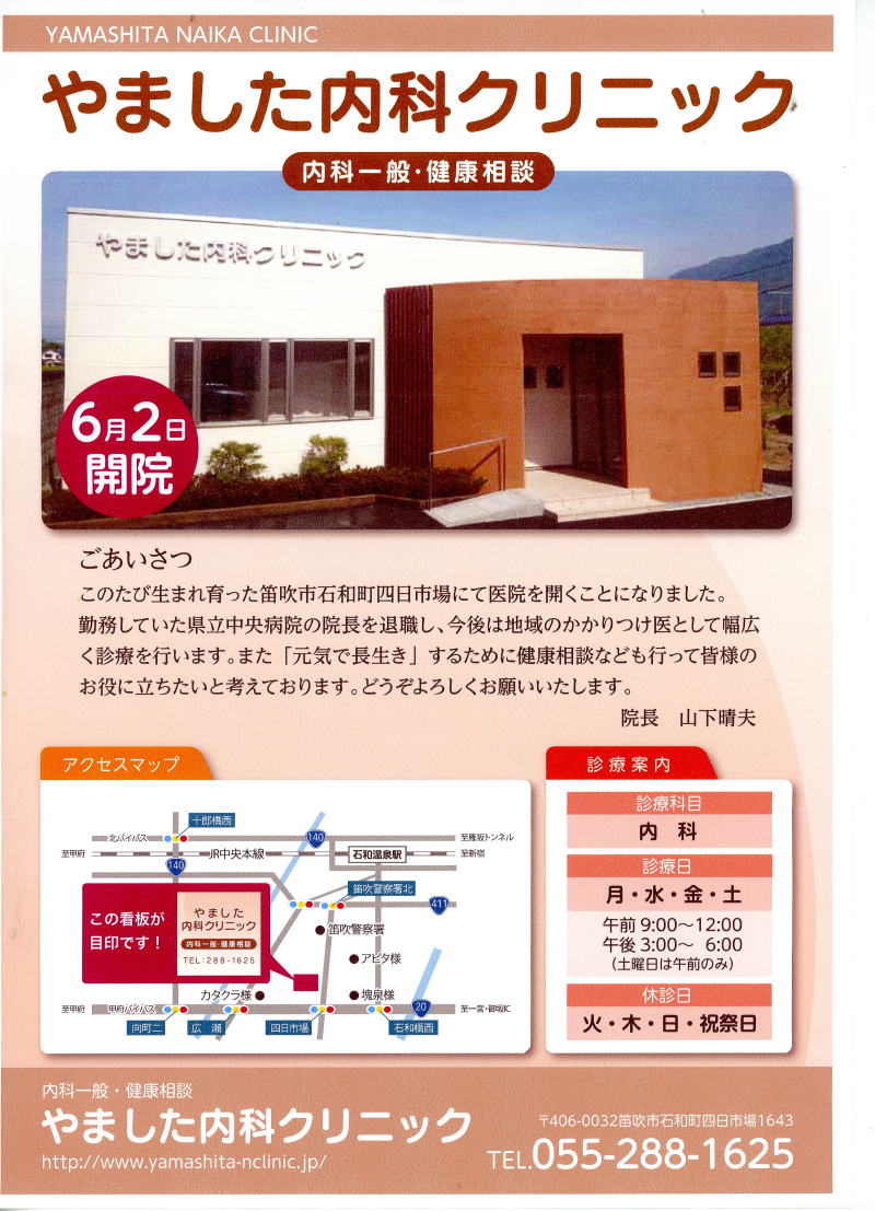山下晴夫氏(4組)が石和に やました内科クリニックを 6月2日開業 しました TEL:055-288-1625 http://www.yamashita-nclinic.jp/ 笛吹市石和町四日市場1643 開業のお知らせパンフレット.pdf