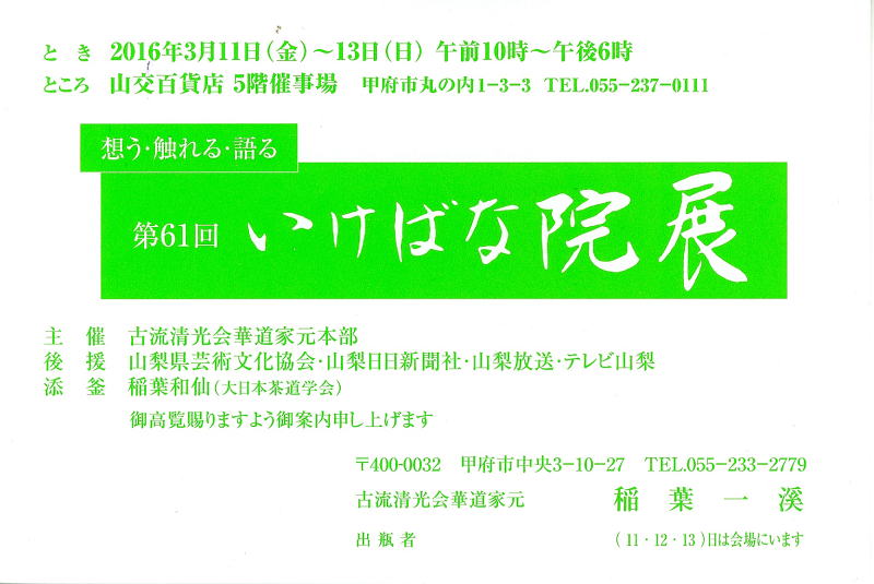 稲葉一渓(12組 稲葉一俊)さんの 第61回 いけばな院展 が(3月11~13日)開催されます