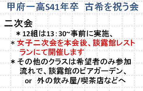 ![]() 女子二次会参加希望者は6組伊藤千永子(雨宮)まで連絡、 または、当日受付で申しでください。 |