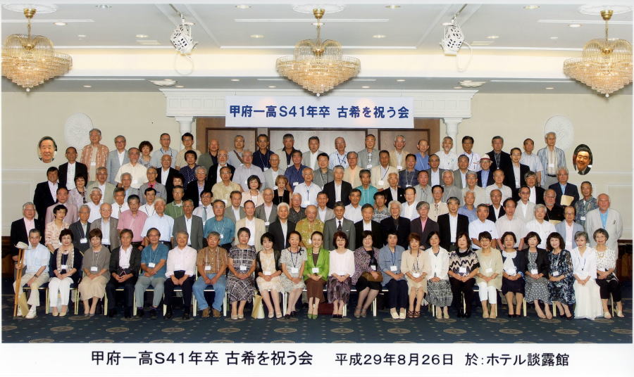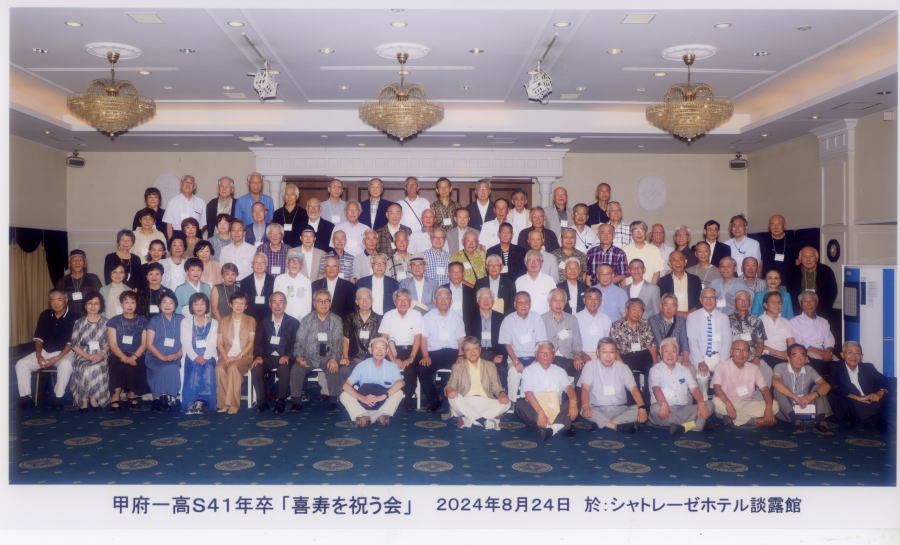 | 同窓会 | ・第64回甲府一高東京同窓会・懇親会2024年7月20日(土) 京王プラザホテル ・創立144周年甲府一高同窓会・懇親会2024年5月18日(土) 甲府記念日ホテル S41からの参加者(丹沢会長ほか16名) ・第63回甲府一高東京同窓会・懇親会2023年7月8日京王プラザホテル S41からの参加者丹沢会長ほか7名 ・創立143周年甲府一高同窓会・懇親会2023年5月20日アピオ甲府 S41からの参加者(丹沢会長ほか6名) ・第62回甲府一高東京同窓会・懇親会2022年7月9日(土)京王プラザホテル S41から5名(丹沢同窓会長参加) 。第142周年甲府一高同窓会 2022年5月28日 甲府一高にて総会のみ開催 ・第61回甲府一高東京同窓会・講演会 2021年10月23日(土)主婦会館プラザエフ ・第141周年甲府一高同窓会総会 2021年5月29日(土) 甲府一高視聴覚室 懇親会は中止 ・第140周年甲府一高同窓会総会 2020年11月21日13:30〜 甲府一高にて総会のみ開催 懇親会は中止 ・甲府一高創立140周年記念式典・記念講演会 2020年10月22日(木) ・第60回甲府一高東京同窓会 2019年7月6日(土)京王プラザホテル S41から9名参加 ・第139周年甲府一高同窓会 2019年5月19日(土)甲府記念日ホテル 2019同窓会S41&記念誌 ・第59回甲府一高東京同窓会 2018年7月14日(土) ホテルグランドパレスで開催されました。 S41から12名参加しました ・第138周年甲府一高同窓会 2018年5月19日 湯村富士屋ホテル 2018同窓会記念誌pdf ・第58回東京同窓会 2017年7月8日 ホテルグランドパレス S41から13名参加しま ・第137周年甲府一高同窓会 2017年5月20日 湯村富士屋ホテル S41の参加者 2017同窓会記念誌p.pd ・第57回東京同総会 2016年7月9日 ホテルグランドパレス S41は13名(甲府から3名)参加 ・第136周年甲府一高同窓会 2016年5月21日 富士屋ホテル S41他スナップ写真 No136周年同窓会誌.pdf ・第56回東京同窓会2015年7月11日(土)今年はホテルグランドパレスで開催 S41同期が11名参加しました。 ・第135周年甲府一高同窓会が2015年5月16日甲府冨士屋ホテルで開催。 S41同期約20名参加 2015年 同窓会記念誌.pdf ・第55回東京同窓会2014年7月26日(土)東京會舘で開催されました。 S41同期が19名参加しました。(二次会を含む) ・第134周年甲府一高同窓会が2014年5月17日(土)甲府富士屋ホテルで開催されました S41同期 約30名参加 2014年同窓会記念誌pdf ・同窓会・甲府一高 発行の記念誌(主に強行遠足関連) |