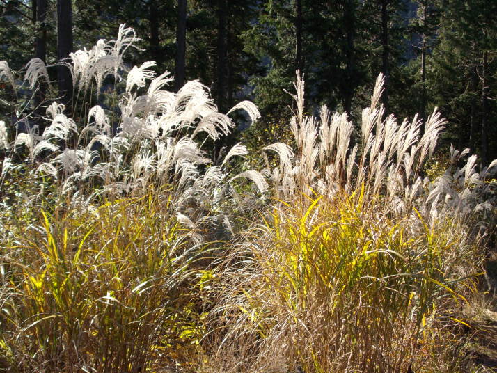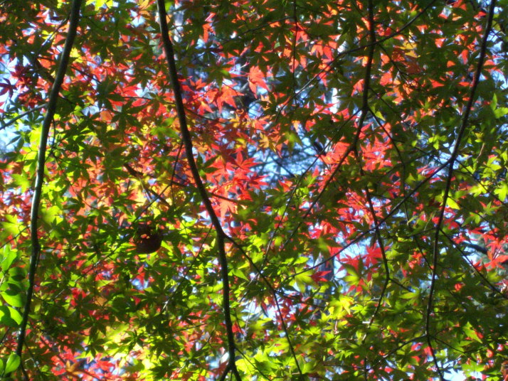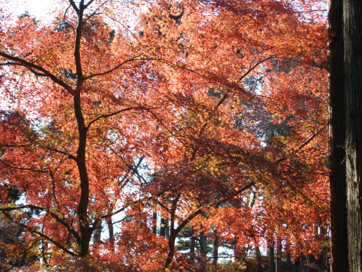 | 八丁平 | 13:05 | 逆光で赤く透き通ったもみじの前で記念撮影。 |