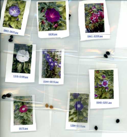 | 当財団では以下の全ての項目に同意される方にのみ種子の頒布(販売)をしております。 同意されない方には種子の頒布はできないことをご了承ください。 1.入手した種子の改変・改良および第三者への分譲等は行わないでください。 2.入手したアサガオに関して、随筆、論文等を執筆される場合には、「この種子は、 国立大学法人九州大学から提供されたものである」ことを書き添えてください。 3.この種子は、国立遺伝学研究所および九州大学の研究活動によって得られた実験 的性格のものであり、品質等に関する保証はありません。 平成23年3月 財団法人 遺伝学普及会 準傭するもの ・発芽処理(芽切り)の方法:市販されているアサガオの種子は発芽処理をしているため、そのままで発芽します が、今回頒布している種子は、そのまままいても全く発芽しないか、一部しか発芽しません。これはアサガオの 種皮が非常に硬く吸水しないためです。そのため、必ず「芽切り」と呼ばれる、種皮に傷をつける操作をしてか ら種子をまいてください。 具体的には、カッターナイフ、ハサミ、爪切りなどで、種子のどこか一部に中の白い部分が少し見える程度傷 をつけてください。間違って大きな傷をつけてしまっても多くの場合問題なく発芽します。また、キリや千枚通 しで種子の一部に穴をあけても良いでしょう。一般に言われている、水に一晩つけてまくことの意味はほとんど 意味がありません。 ・栽培用土:市販されている草花や野菜用の培養土はどれを使っても多くの場合うまく育ちます。また肥料が最初 から含まれている培養土は元肥を入れなくて良いため便利です。変化アサガオは普通のアサガオと比べて成長が 遅く弱いため、もし花壇等の地面に植える場合でも直まきせず、鉢で青首してある程度大きくなってから移植し てください。 ・植木鉢:通常は1本のアサガオの育苗に3号鉢(直径9cm)、本植え(観賞・採種)には5号(15cm)鉢を使い ますが、最初から大きめの鉢に構えてもあまり問題はありません。鉢の種類はビニールポット、プラスチック鉢 や駄温鉢(堅焼き鉢)で良いですが、素焼き鉢は乾きすぎるのでよくありません。 ・支柱:鉢植えの場合、市販のアサガオ用のあんどん(支柱の長さ45cm“60cm)が便利でしょう。また1 {2mのポール(ビニール被覆をした鉄棒やしの竹)を使っても良いですが、倒れないようにしっかりとロープ 等で固定します。 ・肥料:元肥としてマグアンプK(小粒か、中粒)を培養土1リットルあたり3−5グラム程度あらかじめ混ぜて おくと追肥の手間がかかりません。または、生育途中で、発酵油かす、プロミックス等の置肥やハイポネックス 等の液体肥料をあげると良いでしょう。 ・水やり:基本的には午前中と午後の2回たっぷりと水やりしてください。ただし、夕方以降水分が多すぎると徒長する原因になります。植木鉢の種類、日当たり等で状況は違ってきますので、しおれないように適当に加減してください。ベランダなど雨がかからない栽培場では葉にも水がかかるようにすると菓ダニの発生が防げます。 ・栽培場:完全な日陰でなければ栽培できますが、できるだけ長い時間直射日光の当たる場所が栽培に適しています。また街灯の下やベランダ等の夜も明るい場所だと、短日性植物のアサガオは花が咲かないことがあります。 ・病虫害:最近、全国的にホコリダニによる成長点の吸害が見られます。生育途中で葉が萎縮し成長しなくなった場合は、市販の殺ダニ剤を散布すればすぐに回復します。雨のかからない場所で栽培しておくと菓ダニの発生が見られますが、これも殺ダニ剤を散布します。エビガラスズメ(芋虫)、ヨトウムシ等が発生した場合は定期的に殺虫剤を散布します 栽培方法 1)種まき:熱帯起源のアサガオは発芽に高い温度を必要とします。そのため、十分暖かくなってから種子をまい てください。できれば5月中旬から6月になってまいた方が失敗が少ないでしょう。 前述したような方法で「芽切り」した種子を、培養土を満たした鉢やプランターに1−1.5cmの深さになるよ うにまきます。まいた後は、系統番号(品種名)を書いたラベルを挿し、たっぷりと水やりし、発芽するまで 土が乾かないように管理します。 2)皮むき・移植:もし発芽してきた子葉が種皮を除けず、皮をかぶったままの場合は、水やりして種皮が柔らか くなった後に、指で丁寧に取り除いてください。そのままにしておくと枯れてしまいます。移植が必要な場合、 子葉が展開してすぐ、側根があまり出ていない状態で移植した方が苗が痛みません。移植が遅れた場合は、根 のまわりの土をできるだけ落とさないようにするか、鉢から土ごと抜いて移植してください。 3)支柱立て:蔓が伸び出してきたら、行灯(あんどん)やポールを立てて半時計回りに蔓を巻き付けます。また 小鉢やビニールポットで育苗している場合は、支柱を立てる前に大きめの鉢に移植します。渦など巻き付く力 が弱い系統では、適宜蔓を