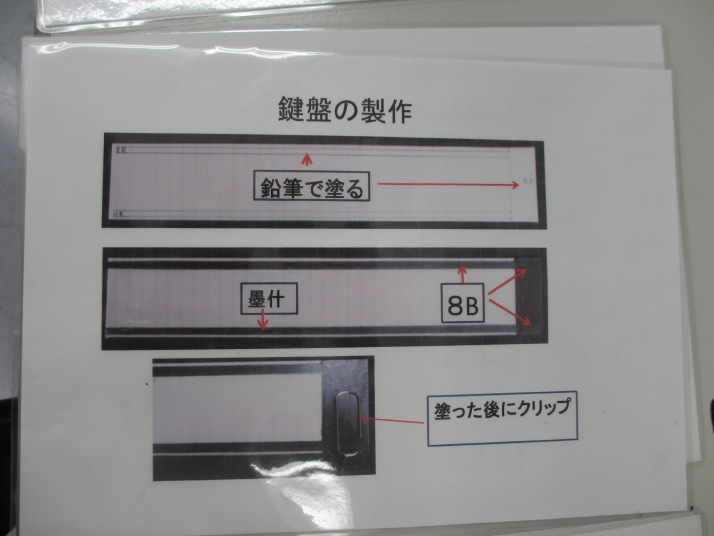 鍵盤の制作図、釘を塗った黒帯の上でスライドさせ音程を合わせる |