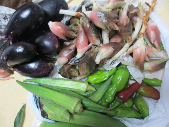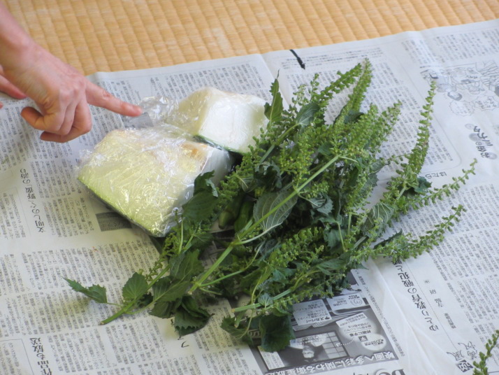 ・内藤さんは農園から産地直送朝採り、冬瓜、青シソの実、シシ唐、オクラを持参