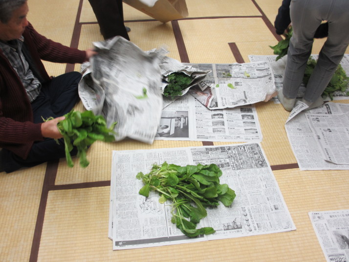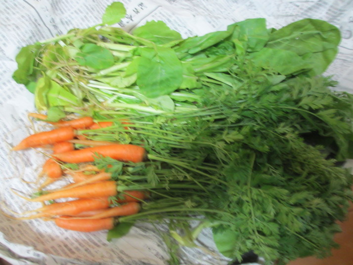 ・内藤さんは農園から産地直送朝採り、小人参と小松菜。少人数なので分け前が多い!