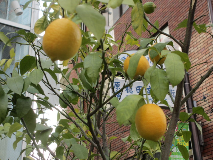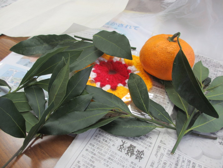 ・尾崎さんから、アクリル毛糸で編んだカラフルな雑巾、関岡さん宅の庭に実ったみかんとオリーブのプレゼントがありました。