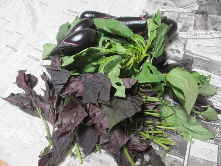 ・内藤農園からのモロヘイヤ、なす、しそ、直送野菜をいただきました。