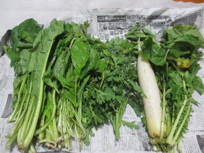 ・内藤農園からは取れたての大根、春菊、小松菜、ホウレンソウをいただきました。月桂樹の葉を関岡さんから。