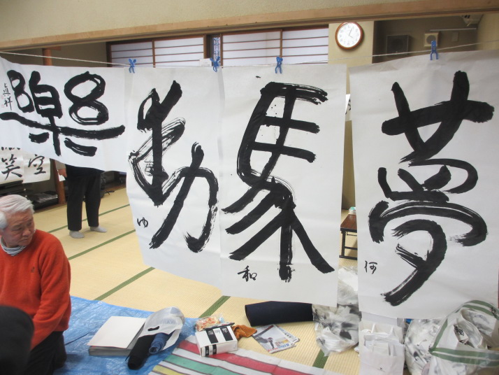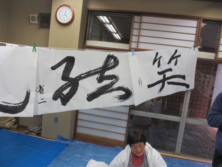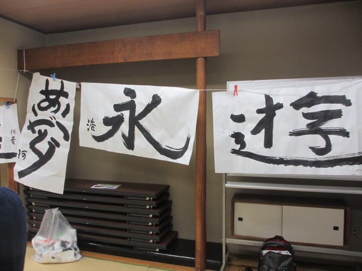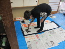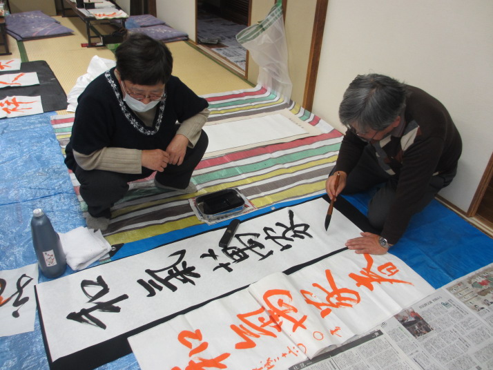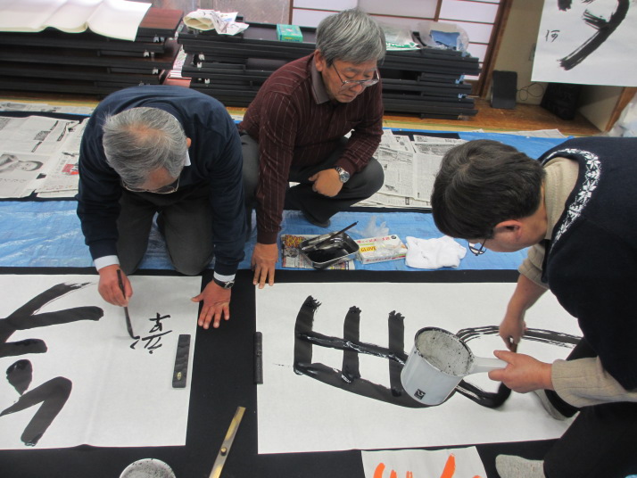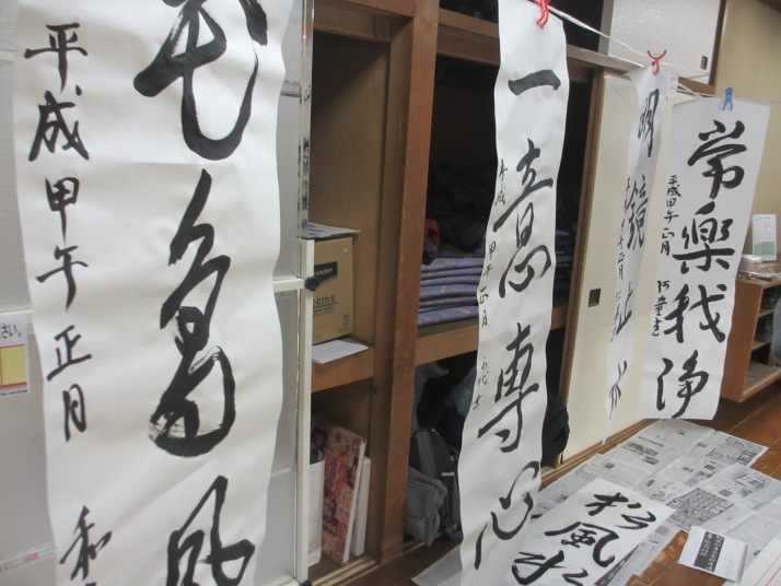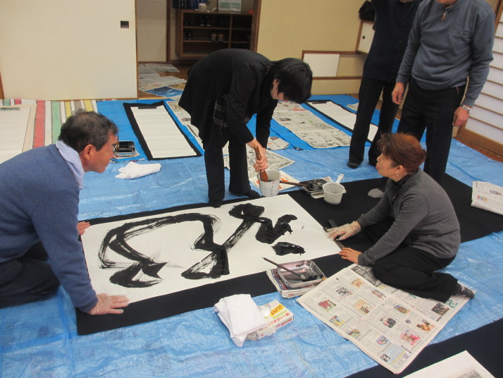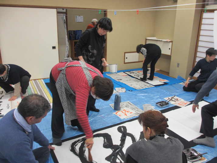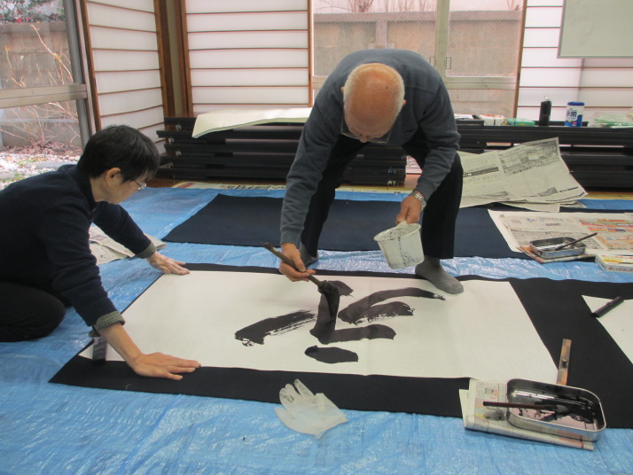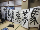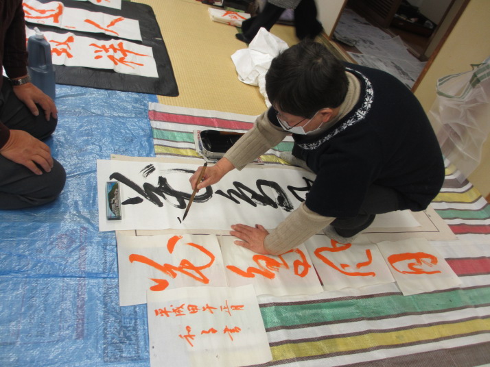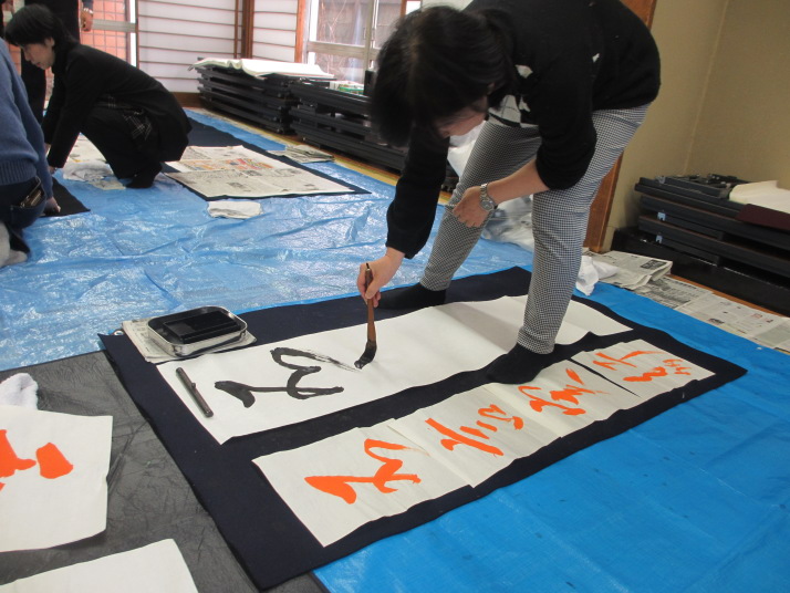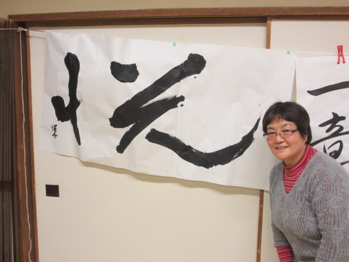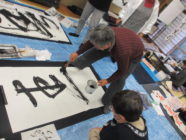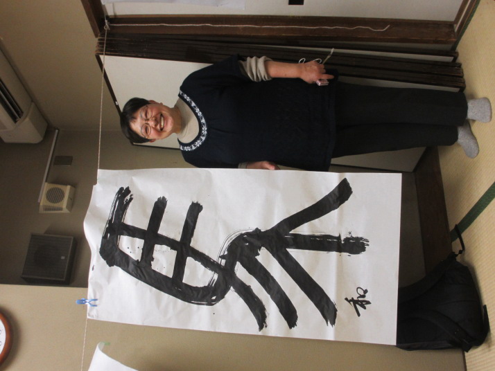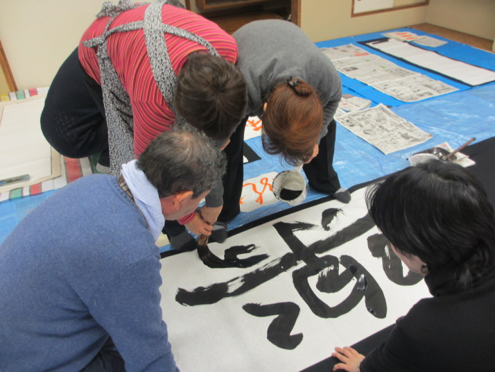 ・2014年のだ一回目は、全紙を使い大筆で書初め。18畳の部屋にシートを敷き詰めて、6人が同時に大きな紙に書ける広さでした。