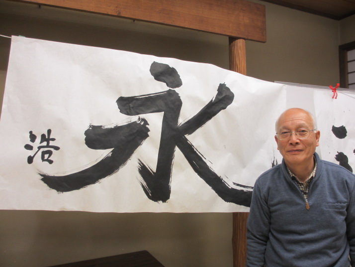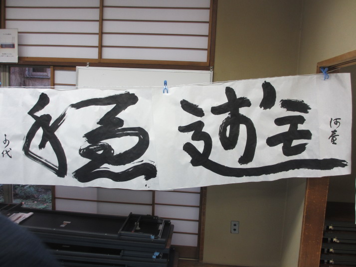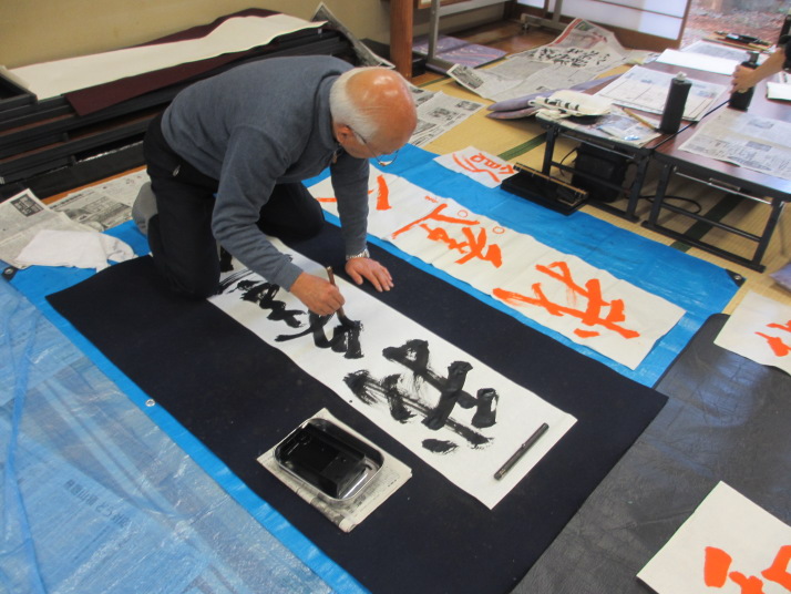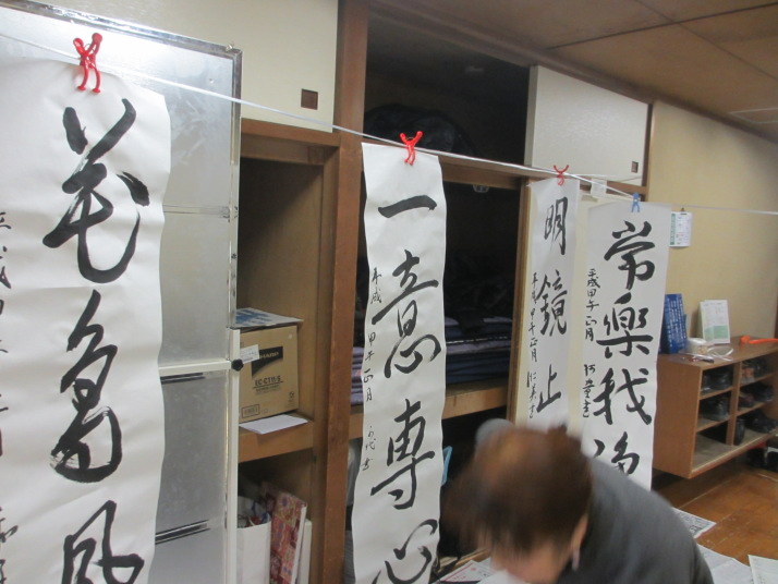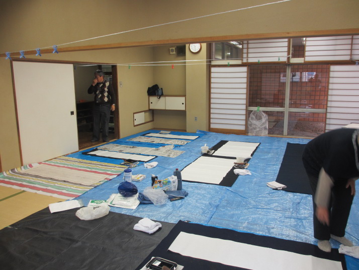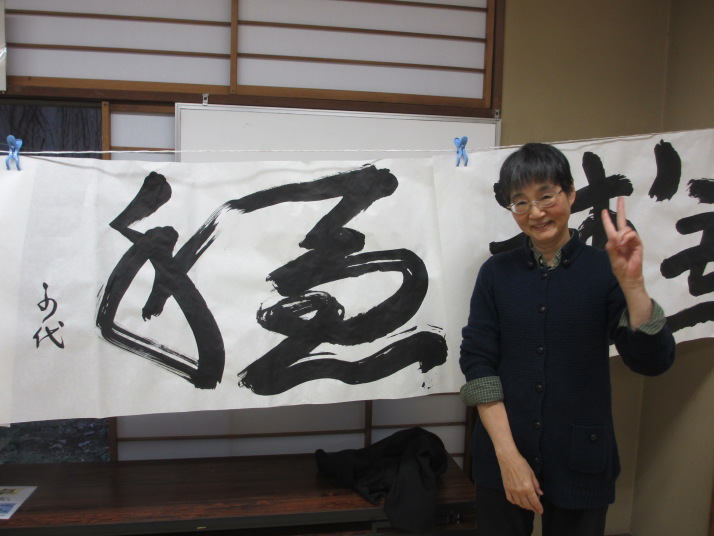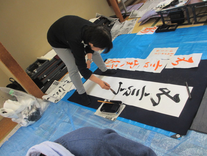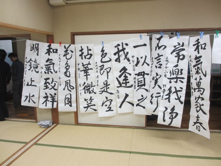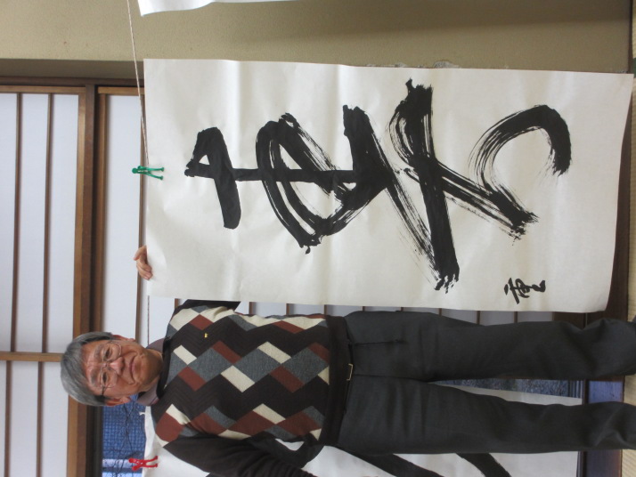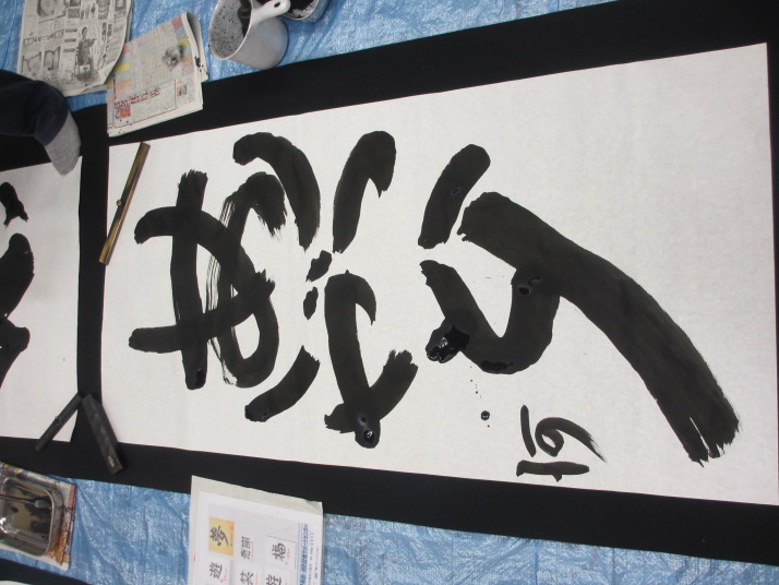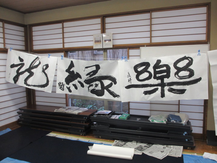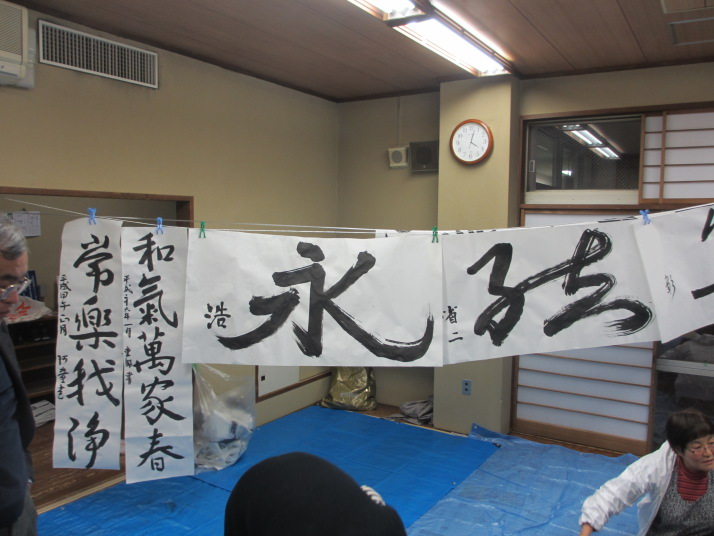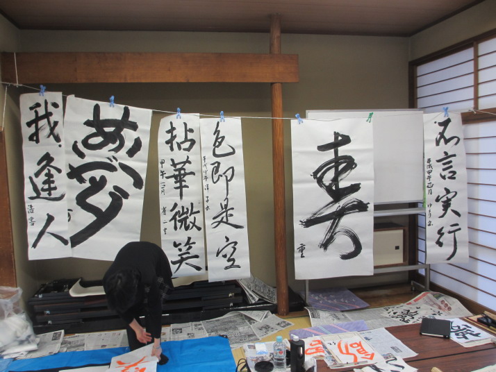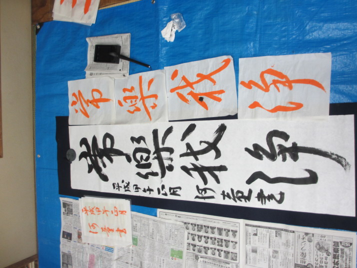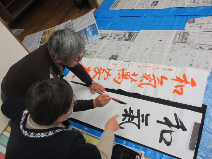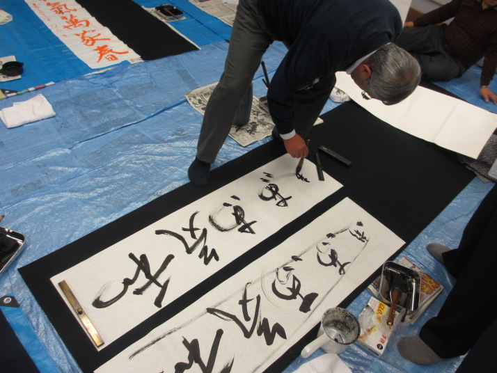 ・2014年のだ一回目は、全紙を使い大筆で書初め。18畳の部屋にシートを敷き詰めて、6人が同時に大きな紙に書ける広さでした。