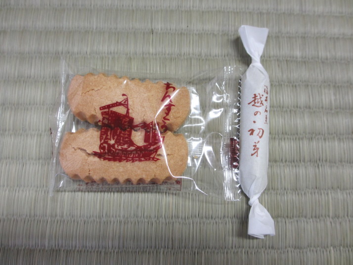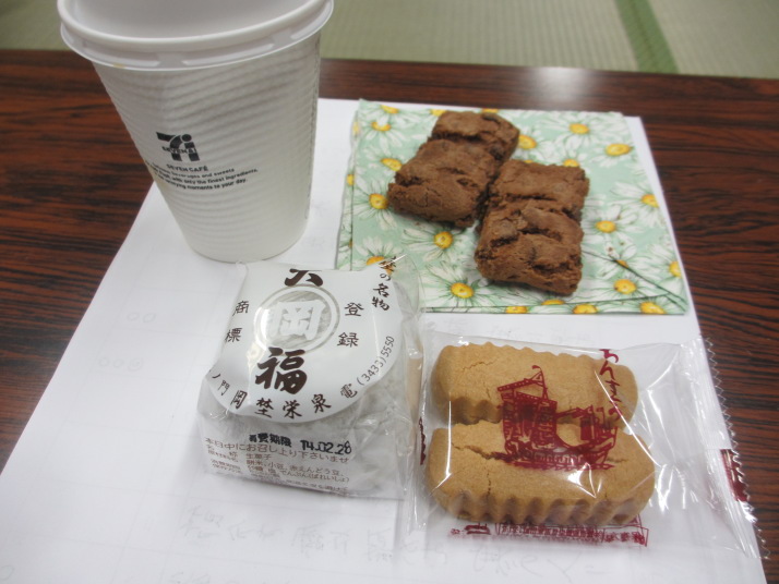 ・コーヒーブレイクはセブンイレブンの入れたてコーヒーと、越の初芽(福井・錦梅堂)、ちんすうこう(沖縄銘菓)、大福(岡埜栄泉)、