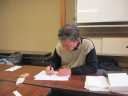 ・内藤師範の指導で、兼題「寒の入り、寒、・・大寒」で1句、冬で2句を提出し、表に書き出し、特選・佳作を選出、作者の解説。