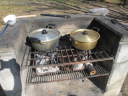 オガライトは炎が無くなってから、鍋・やかんを乗せる。(その頃には炭に完全に火が回っており、強力な火力が出て料理スタートに丁度良い頃合いです。