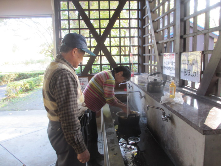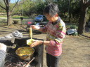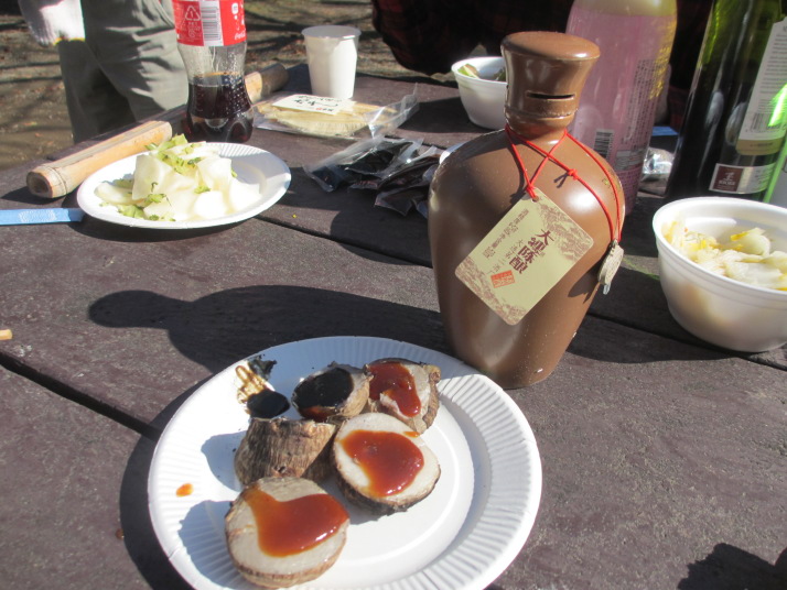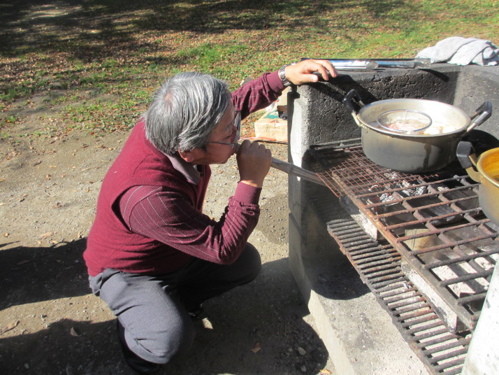 特性一斗缶コンロの強力火力のおかげで、9:25頃から火起こし、それから30分かからずにNo.1,2鍋料理開始、10:50頃にはNo1.芋煮鍋は調理完了。