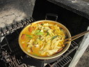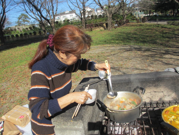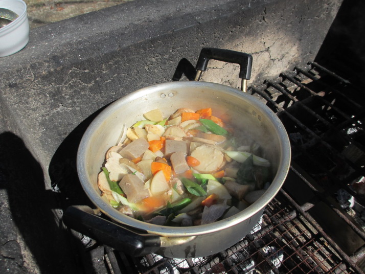 野外料理人の反省:下ごしらえしていただいた材料を鍋に入れて、適当に味付けして煮ただけですが、素材の良さに活かされて