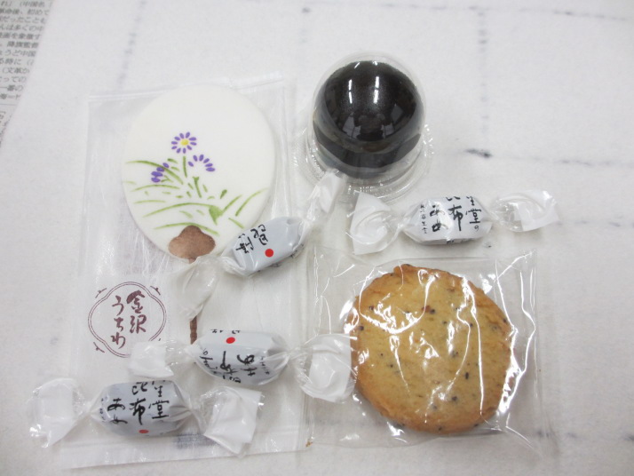 ・おやつは奥井海生堂のこんぶあめ(福井)、加藤皓陽堂の金沢うちわ(干菓子)、沢田屋黒丸(7組新藤さんに東京同窓会で