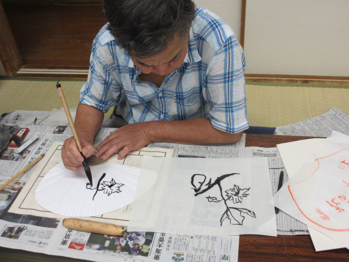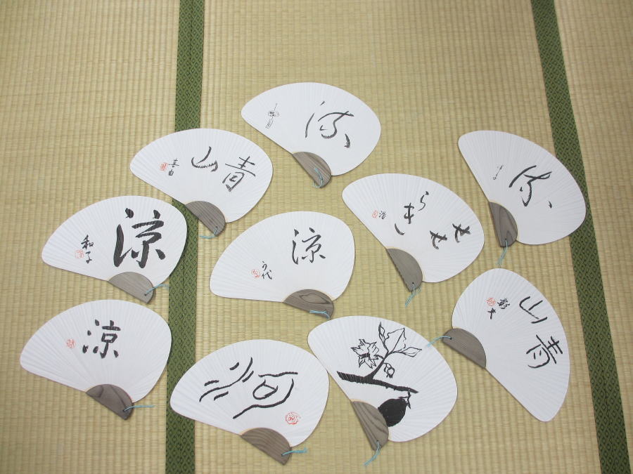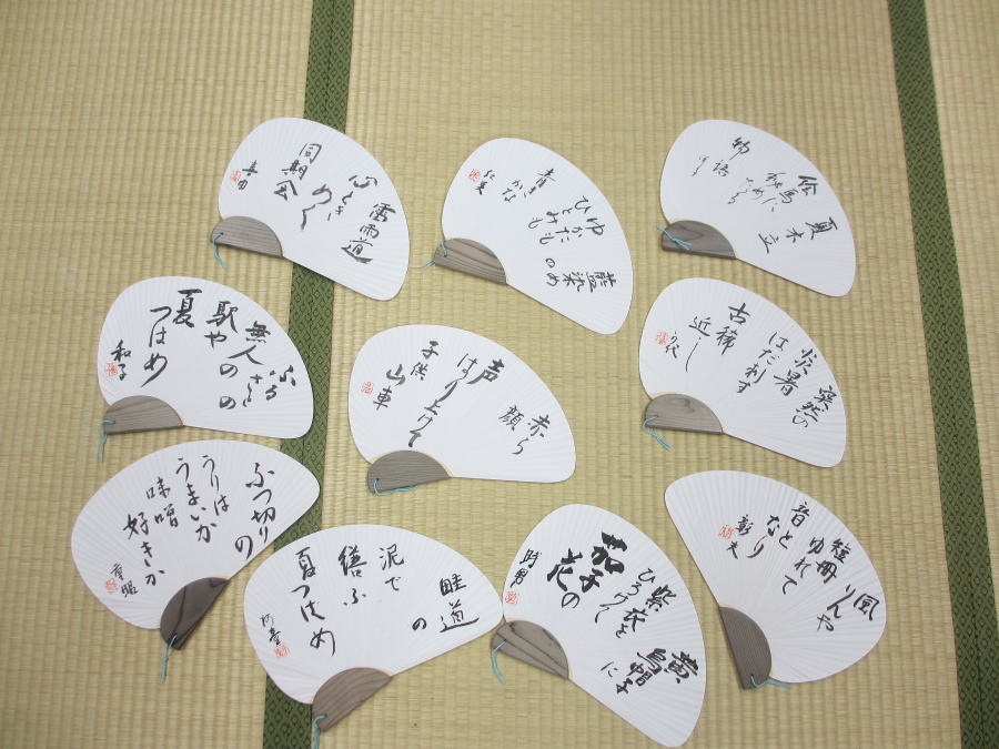 ・作った俳句は、折帳に書いてから、特性の団扇に各自の好きな一句を書きました。裏は涼しげな文字を書いて完成。