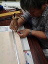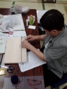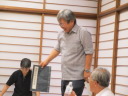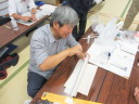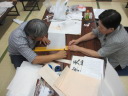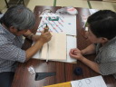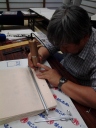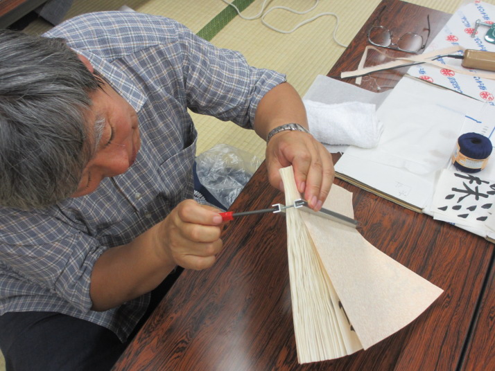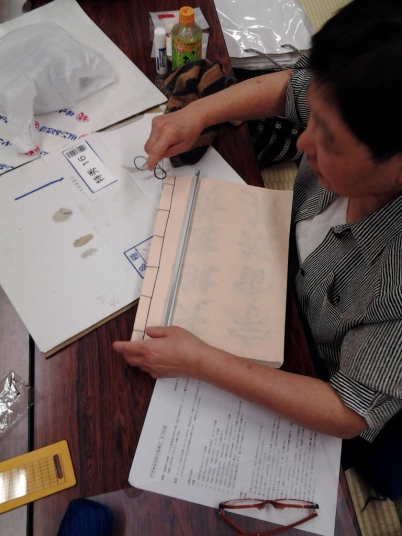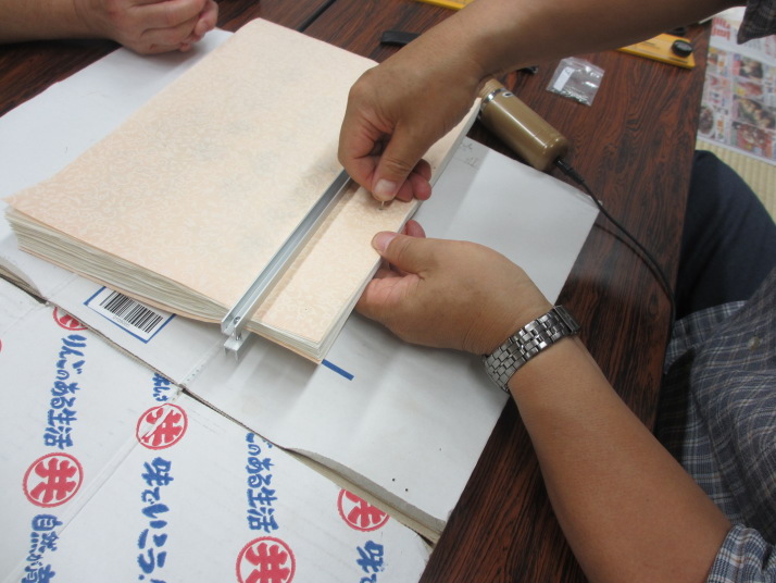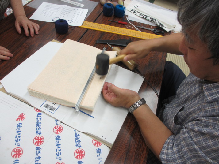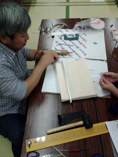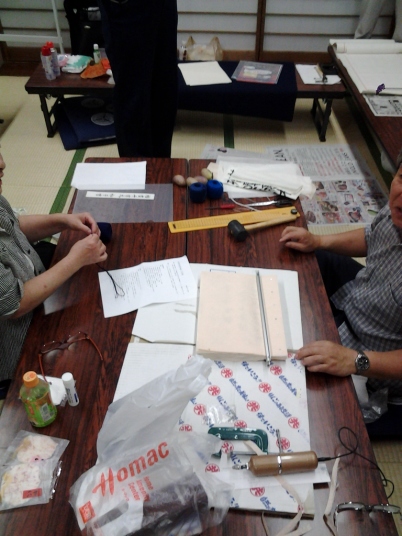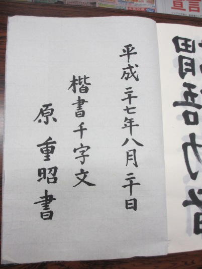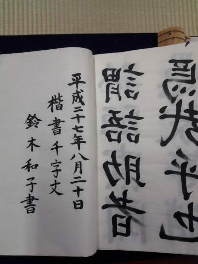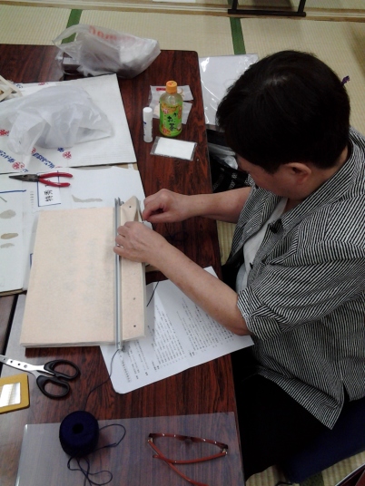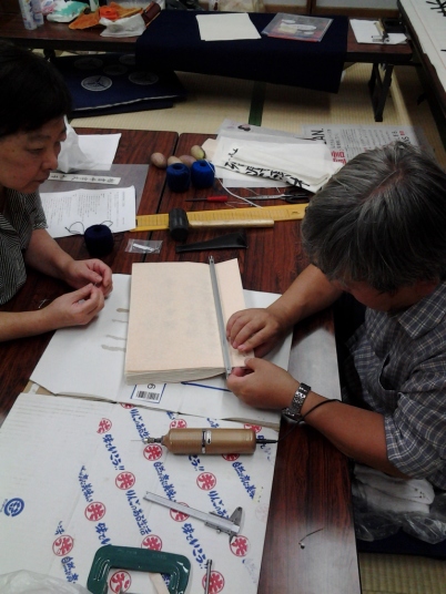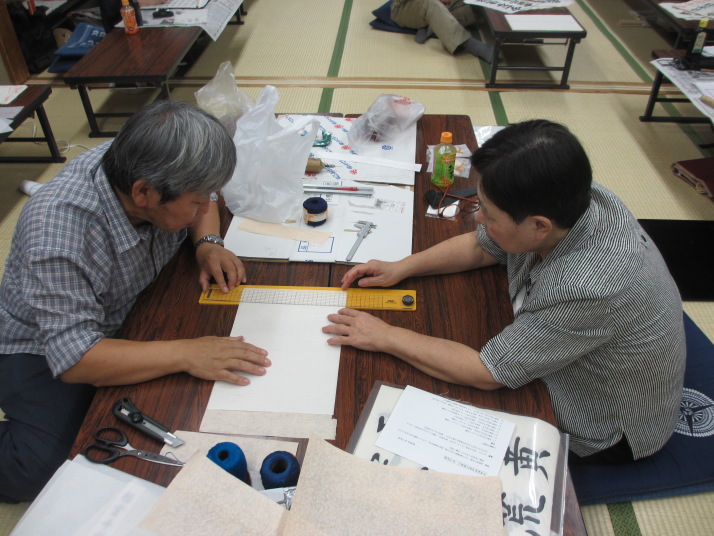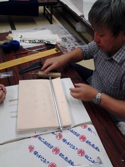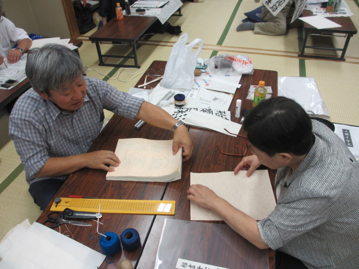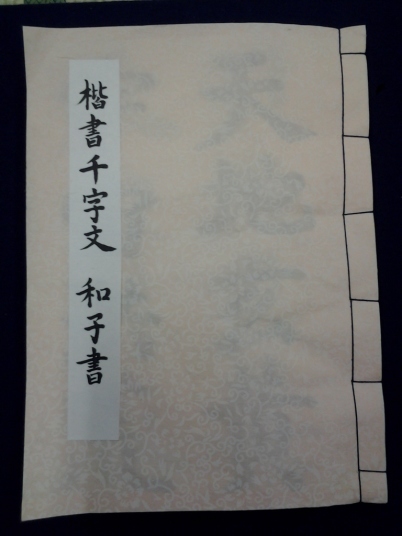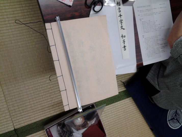 ・鈴木さんが、楷書千字文を書き上げ、和装綴じ本を、原さんの特性製本道具とサポートで完成しました。