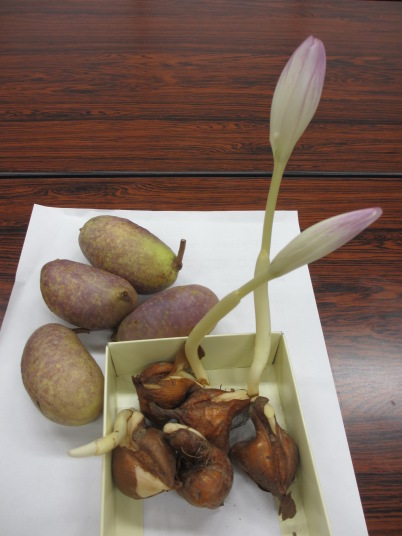 ・原さんが自宅に実ったアケビとコルチカム(土が無くても、球根から花が咲く)