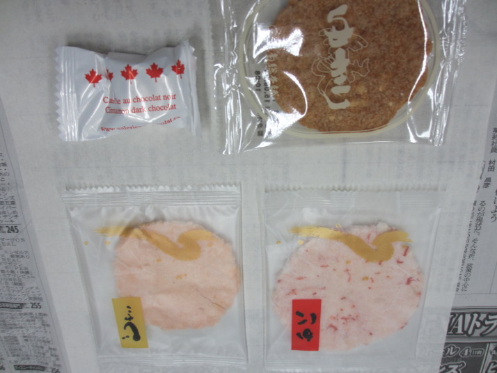 ・カナダみやげのメープルチョコ、名古屋のエビ煎ゆかり、越前海鮮煎餅とコンビニスイーツでコーヒーブレイク