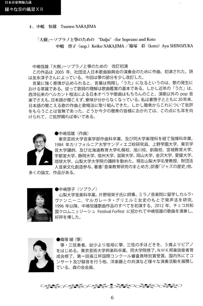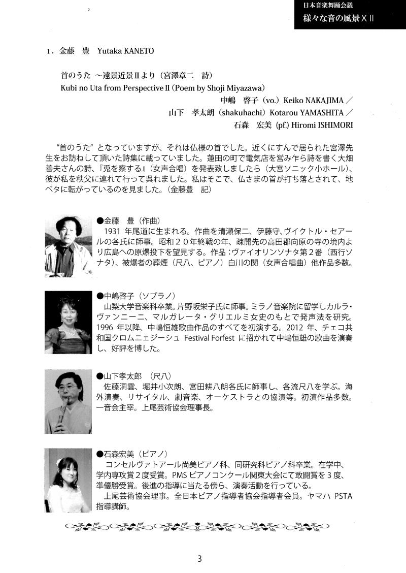 | プログラム 1.金藤 豊 YutakaKANETO 首のうた~遠景近景Ⅱより(宮澤章二 詩) Kubi no Uta from PerspectiveⅡ(Poem by Shoji Miyazawa) 中嶋 啓子(vo.)Keiko NAKAJIMA/山下 孝太朗(shakuhachi)Kotarou YAMASHITA/ 石森 宏美(pf)Hiromi ISHIMORI 2.浅香 満 Mitsuru ASAKA ピアノソナタ Sonate for Piano 大導寺 錬太郎(pf)Rentaro DAIDOUJI 3.シュニトケ Alfed Schnittke ア・パガニーニ“A.Paganini”(1982) 恵藤 久美子(vn.)“Kumiko ETOH 4.中嶋 恒雄 Tsuneo NAKAJIMA 「大樹」~ソプラノと箏のための“Daiju’-for Soprano and Koto 中嶋 啓子(sop.)Keiko NAKAJIMA/篠塚 彩(koto)Aya SHINOZUKA 休憩 5.矢代 秋雄 Akio YASHIRO ピアノソナタ Sonate for Piano(1960) 北川 暁子(pf.)Akiko KITAGAWA 6.北候 直彦 Naohiko HOUJO 「響相」記憶の風景より~ピアノ独奏のための、プレリュードとアレグロ~” Kyoso"from Landscape in Remembrance for pianosolo(Prelude and Allegro) ピアノ 鈴木 菜穂子 pf Naoko SUZUKI 7.原 博 Hiroshi HARA ヴァイオリンソナタ Sonate for Violin(1965) 北川 靖子(vn.)Kiyoko KITAGAWA/林 聡子(pl)Satoko HAYASHI 8.ロクリアン正岡 Locrian MASAOKA 組曲「泣く女」~クラリネットとヴィオラによる(初演) Suite“The Weeplng Woman”by Clarinet and Viola 二重奏組曲「男の死を巡って」-後藤健二氏に捧ぐ一クラリネットとヴィオラによる(初演) Duet suit“The Death of a Man-A tribute to Kenji Goto-Clarinet and Viola 内山 厚志(cl.)Atushi UCHIYAMA/渡邊 田鶴野(va.)Tazuno WATANABE プロデューサー・制作:北條直彦/デザイン:橘川 琢 |
