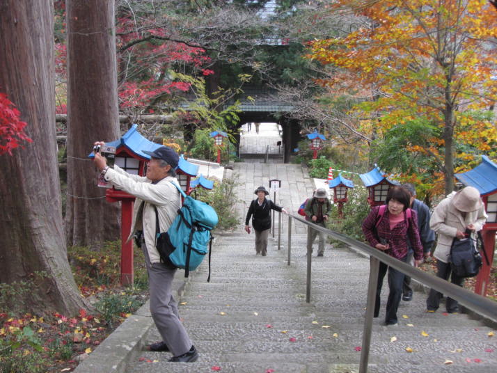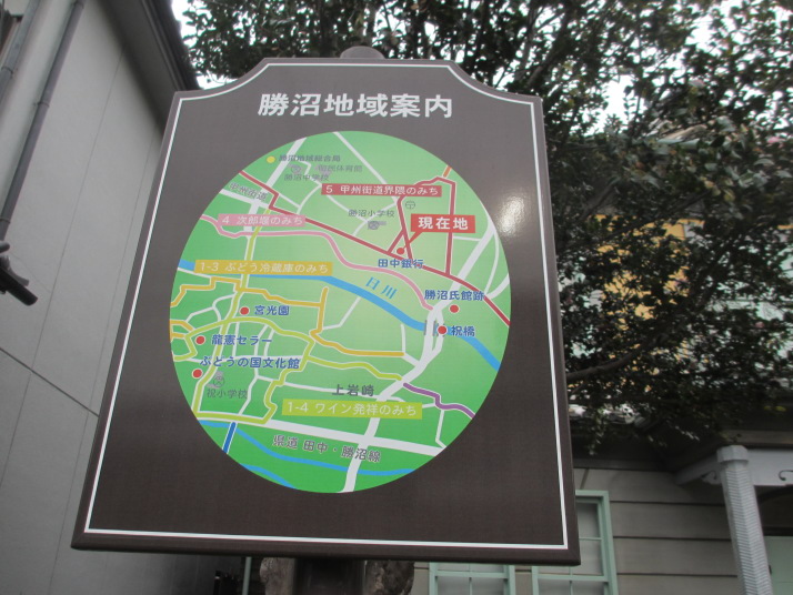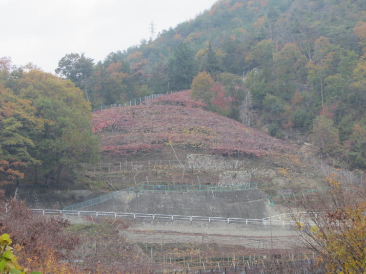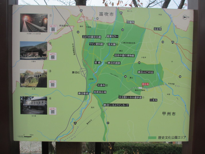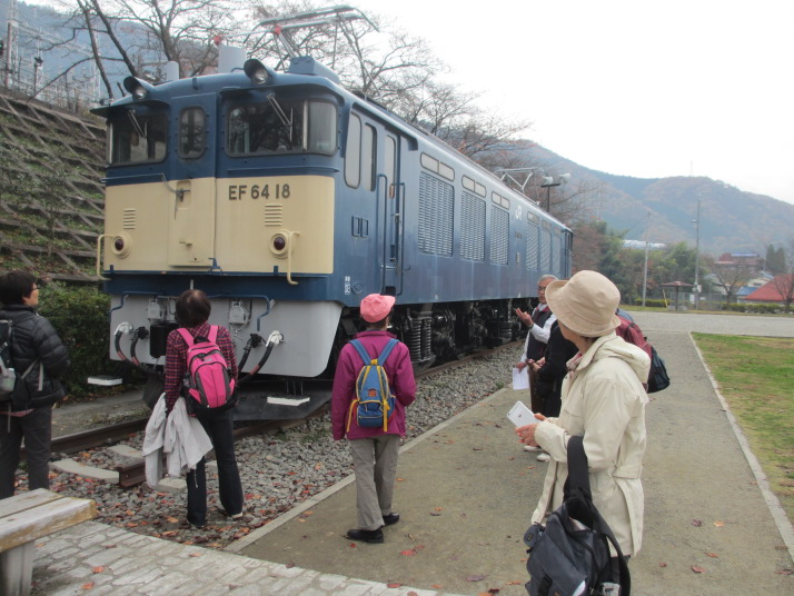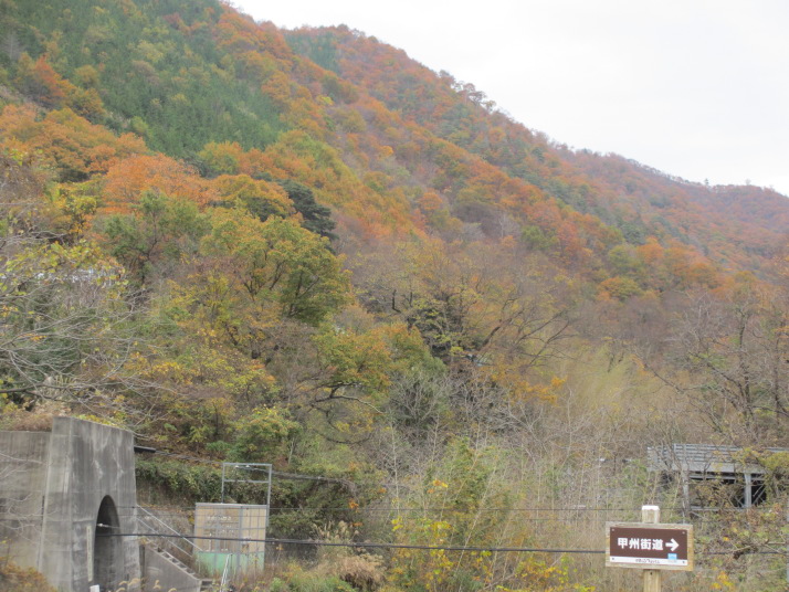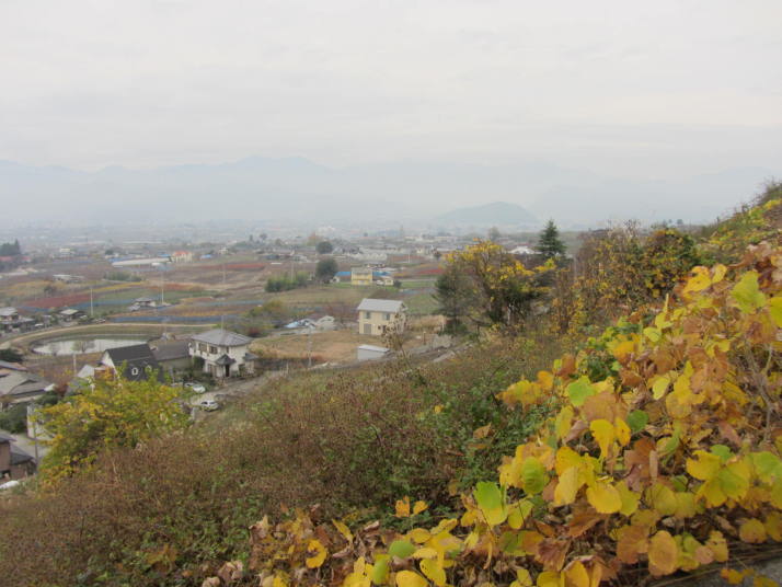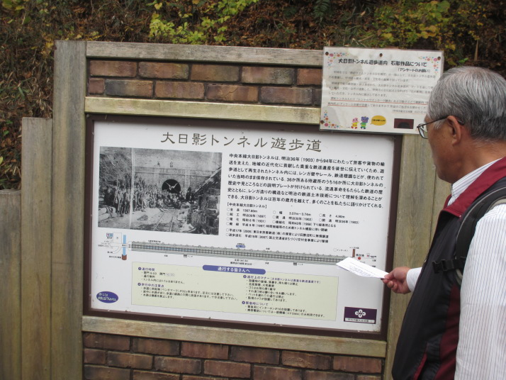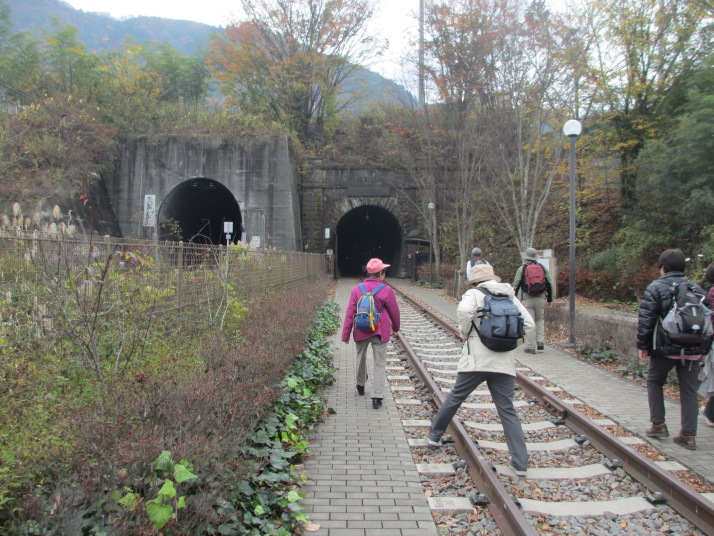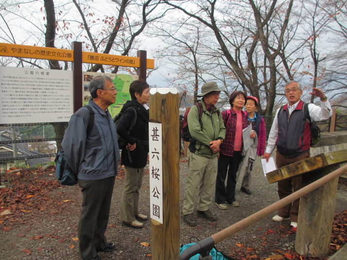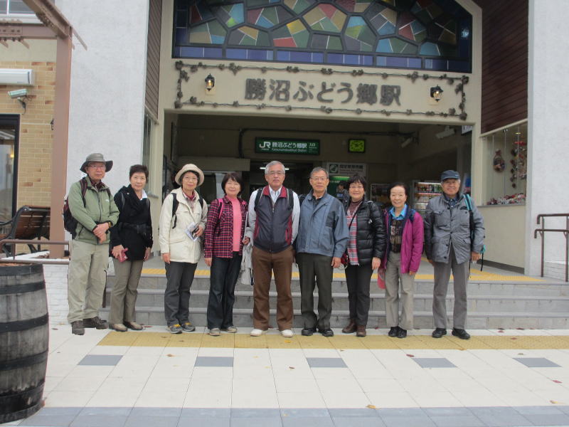 | 2015年は、晩秋のブドウ郷を散策しました。 コース概要 1. 11月23日(月・勤労感謝の日) 集合 10時(勝沼駅改札を出た所) 天気予報では夕方雨だったが、皆さんの心がけが良く。解散まで雨は無。 2.勝沼駅ハイク 歩行距離 約12.5km 駅ー展示電気機関車ー大日影トンネル1.4kmー大善寺(12:00見学終了ーハーブ園13:40―ぶどうの丘14:30ー駅 3.トンネルは開通時もので今は遊歩道。近藤勇の像(最後の戦い跡)を見て、国宝の大善寺本堂を拝観。 4.昼は勝沼中央公園で持参の食べ物で軽食 5.費用:大善寺拝観 500円、ぶどうの丘ワイン試飲 1100円、天空の風呂 610円 6.JR時間 新宿 8:30 勝沼ぶどう郷 9:56 あずさ 高尾 8:44 勝沼ぶどう郷 9:50 普通 ・歩行時間+見学時間で3時間半、13時半にぶどうの丘に到着予定でしたが、ガイドの言うことを聞かない道草おばさん、おじさんでしたので