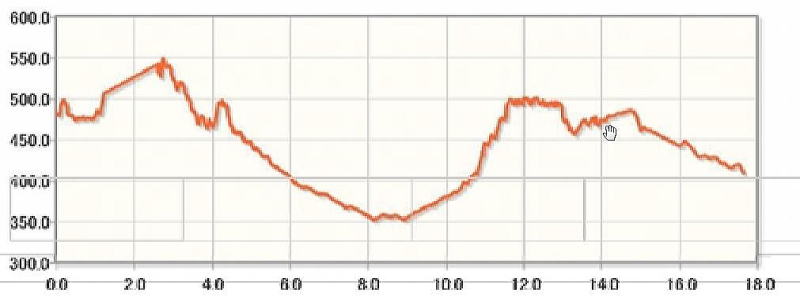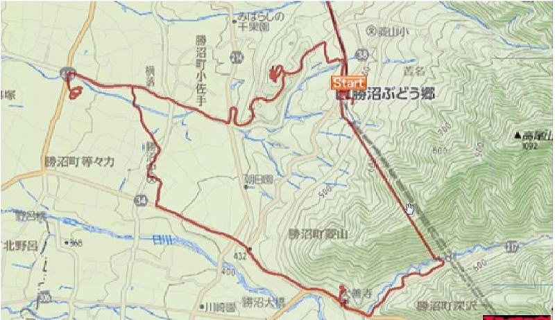標高一番低い所はハーブ庭園です。最初のピークはトンネルを抜けて、道路に着いた辺り、その次の小ピークは大善寺、後半のピークはぶどうの丘です。 |