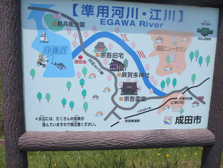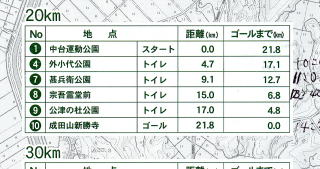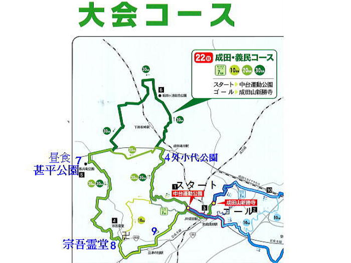 コース図上の地点名と番号(青字)と上の表は対応 到着時間 1.スタート 9:00 2.外小代公園 10:08 3.甚兵衛公園 11:05 昼食 4.宗吾霊堂 12:40 5.公津の杜 13:10 6.成田山 14:30・・・5時間30分 |