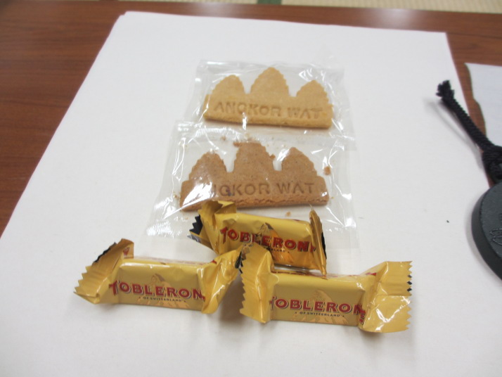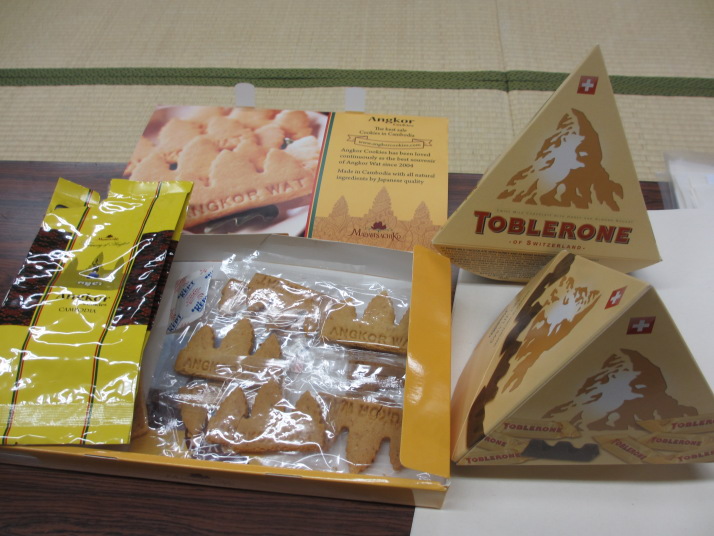 ・お茶請けは、スイスのチョコとカンボジアから上海経由で2週間かけて帰って来たスーツケースの中のおみやげ。