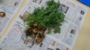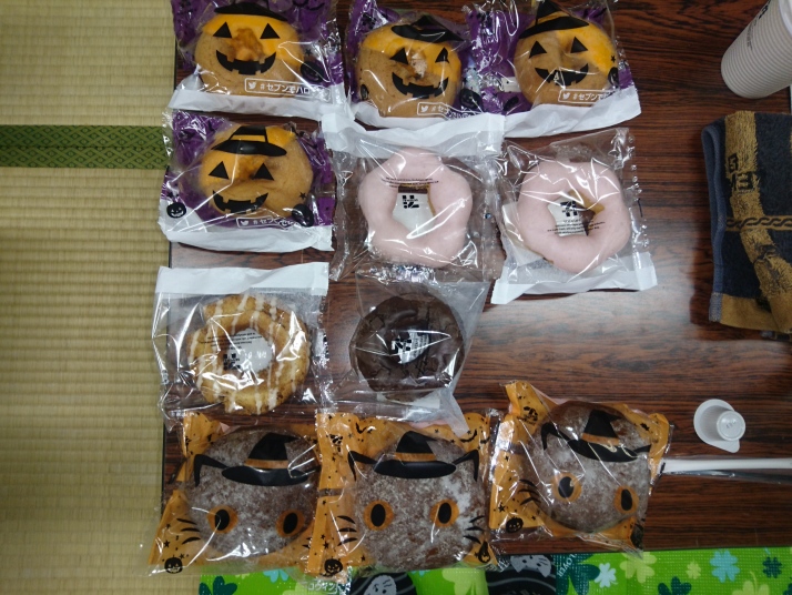 ・おやつは、海老煎餅、信州白樺の大地、ハロウィンバージョンのセブンイレブンドーナッツ、原さん宅のあけび