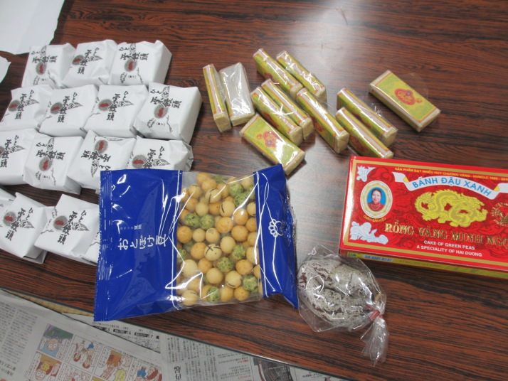 ・今日のおやつは、ひと本石田屋の大きな栗饅頭、おとぼけ豆、ベトナムの緑豆らくがん、