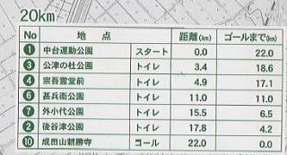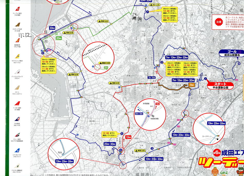 コース図上の地点名と番号(青字) と左の表は対応 到着時間 1.スタート 9:00 3.公津の杜公園 9:45 4宗吾霊堂前 10:00 6甚兵衛公園 11:12 昼食 77外小代公園 12:39 2後谷津公園 13:13・・・ 10成田山新勝寺 14:16 5時間16分 |