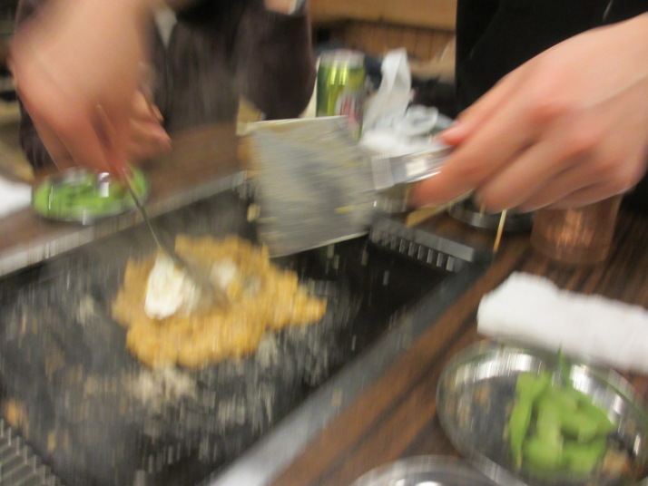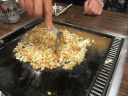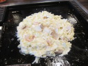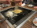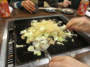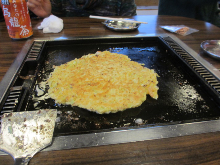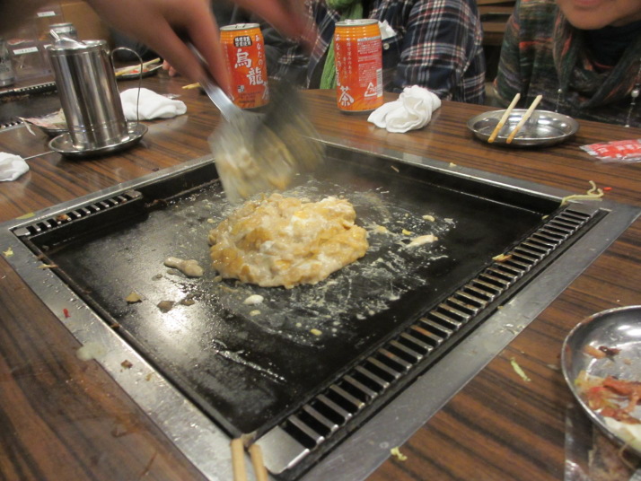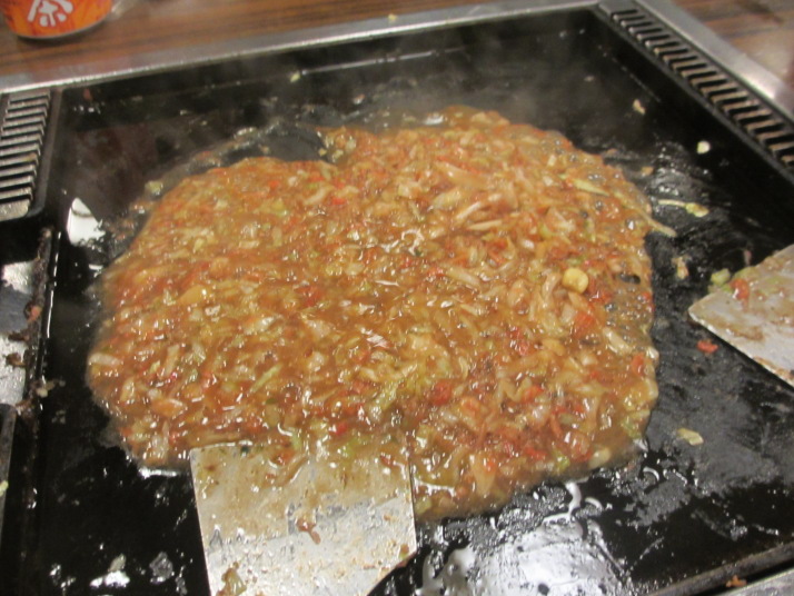 お好み焼きをひっくり返し、鉄板の外へはみ出して |