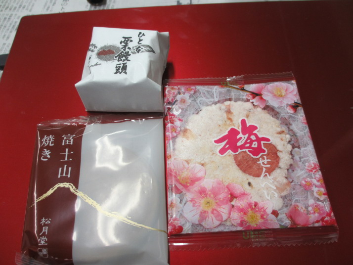 ひと本栗饅頭、富士山焼き、梅せんべい |