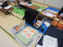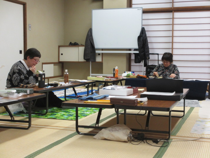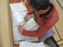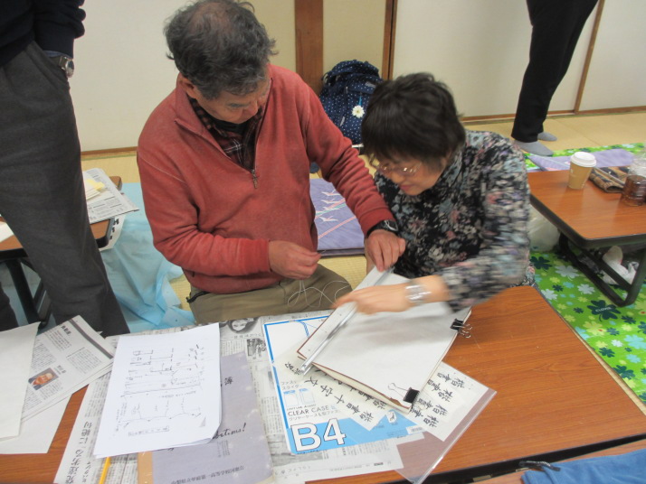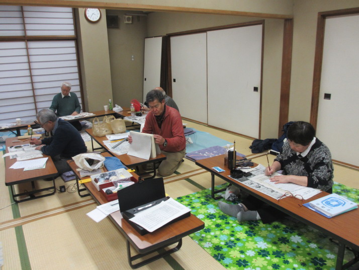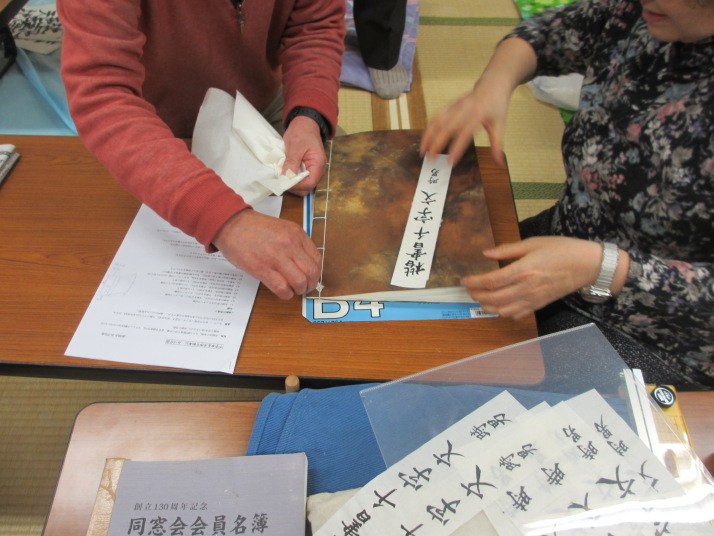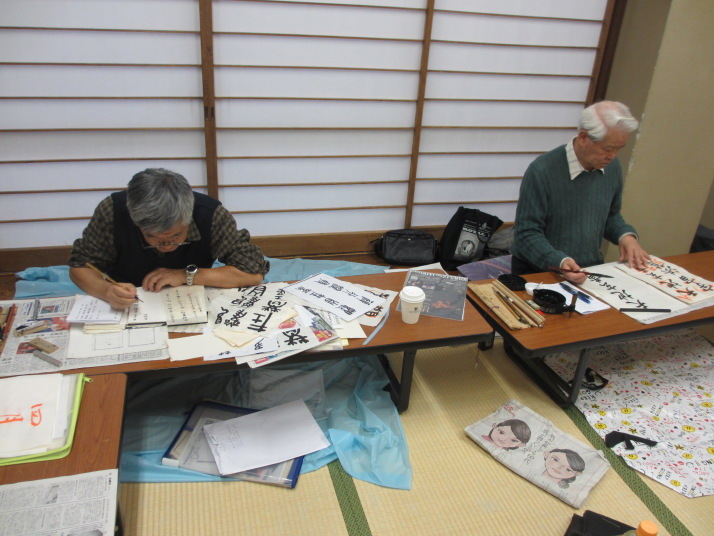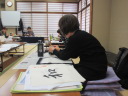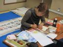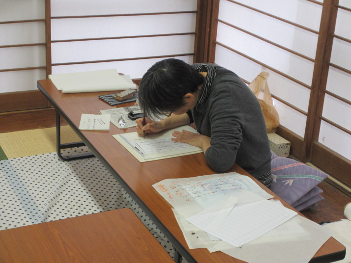 ・山田さんが、千字文の和綴じ製本、瀬尾さんは紙人形展の案内パネル作成、千字文ゴール直前が3名。