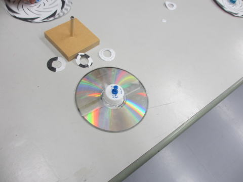 CD盤を使ったコマはぶっつけ本番なので、工作を完成させるのに気を取られ、ベンハムの独楽等いろいろな疑問を投げかけて