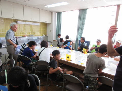 で、7年前から続く夏休み子供工作教室を功刀先生が実施しました。風間、山本がお手伝いをしました。