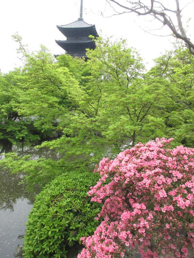 東寺 つつじと新緑の向こうに五重の塔 |