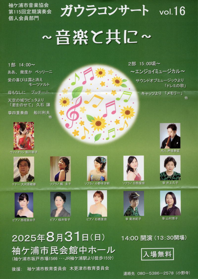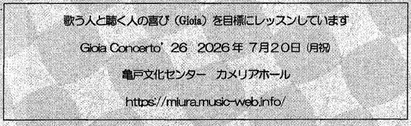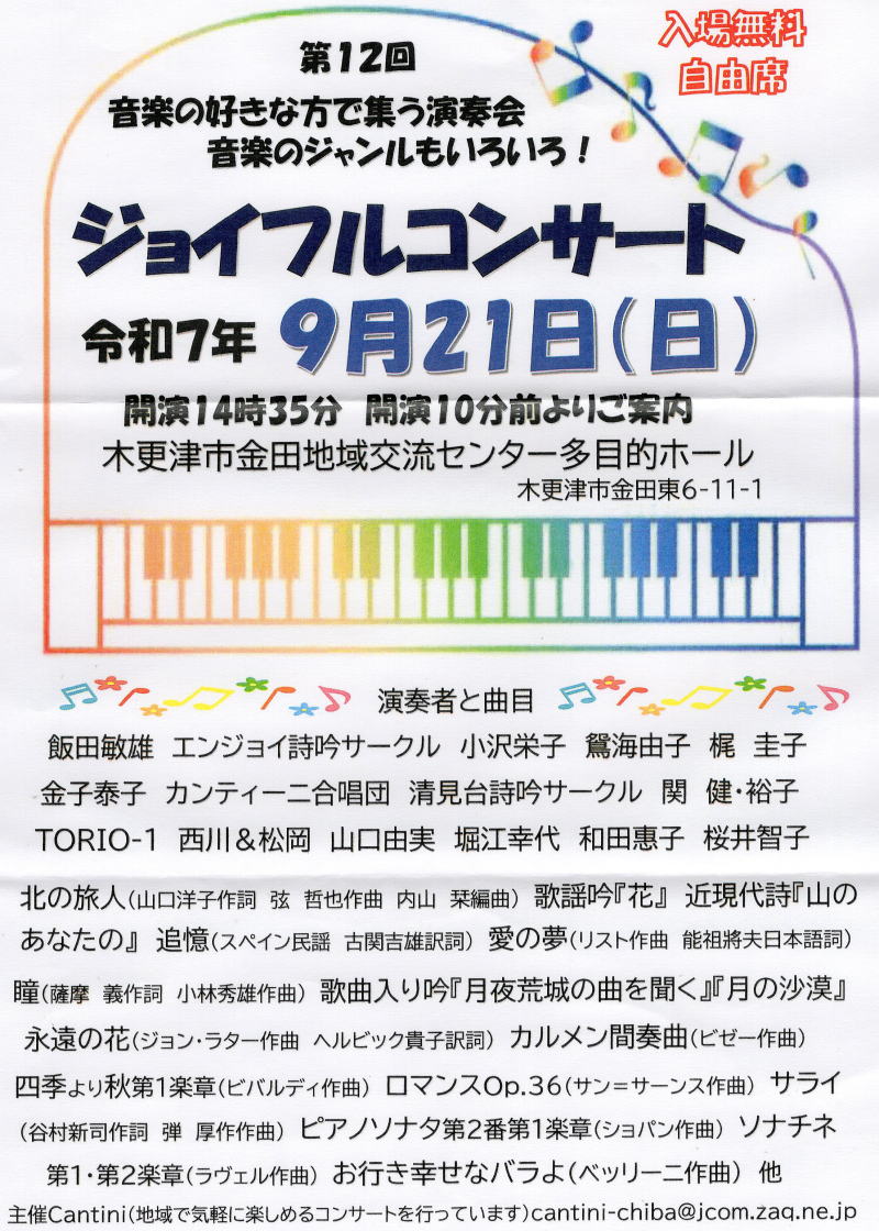| ジョイフルコンサート コンサートちらし.pdf 開催日時:2025年9月21日(日) 14:35~ 開場14:25 会場: 木更津市金田 地域交流センター多目的ホール 場所木更津市金田地域交流センター多目的ホール 歌: (日本歌曲「陸」他) |